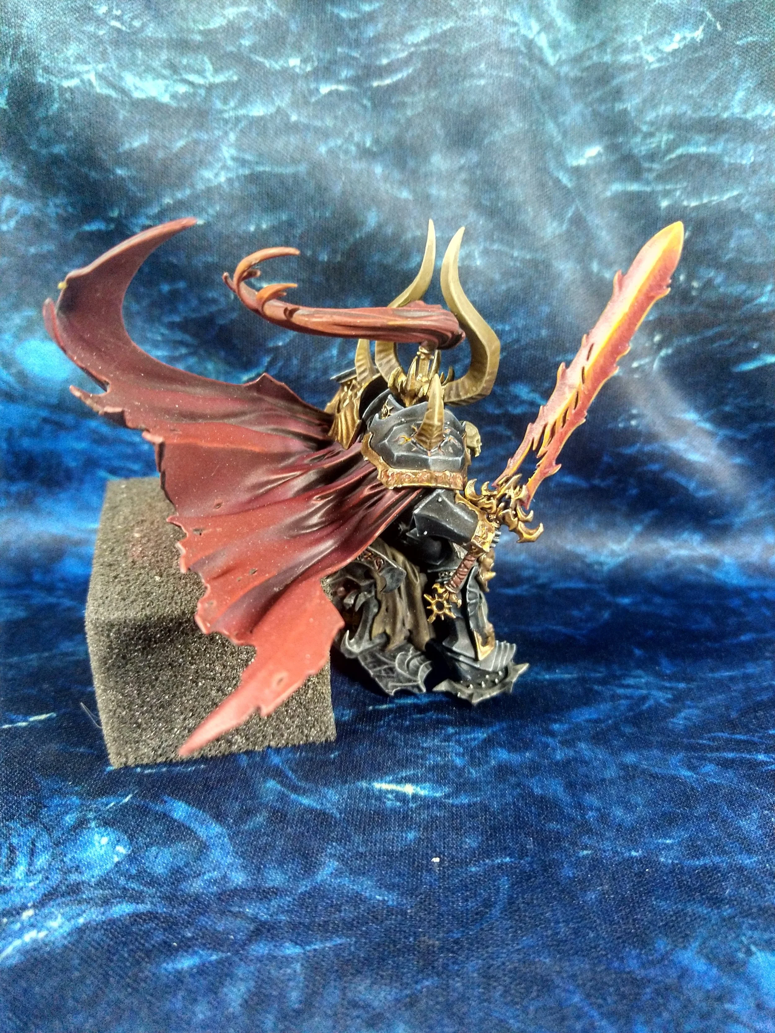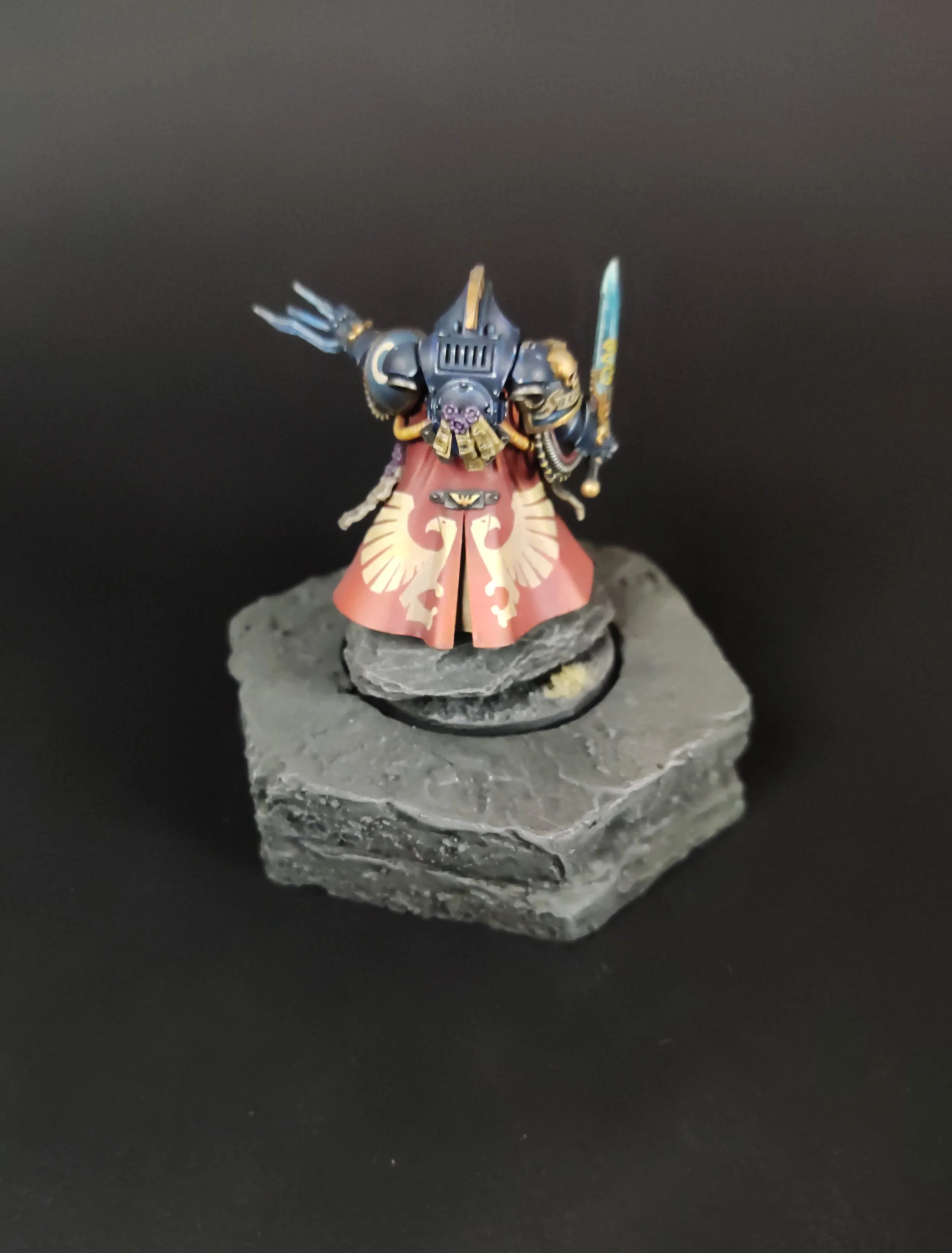 This custom base features a removeable central base for gaming with. The clarity of the gold with subtle shading radiates from his chest plate. Highlights on the rear head guard give contrast and pick up the directional highlighting used on the other elements of the piece.